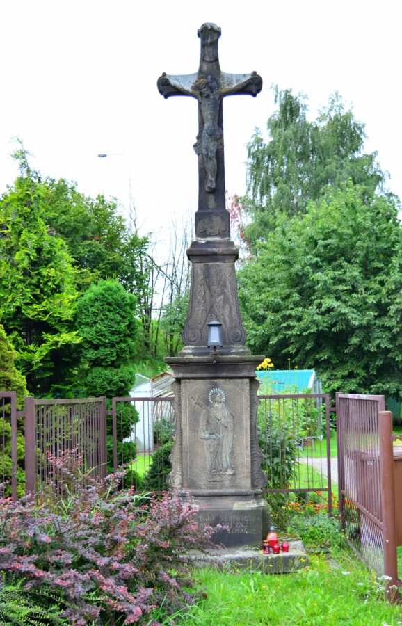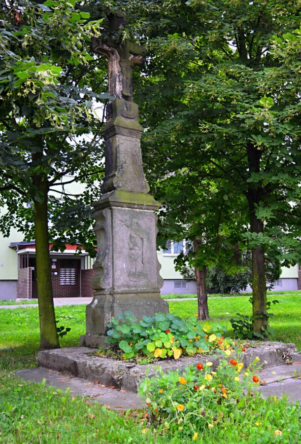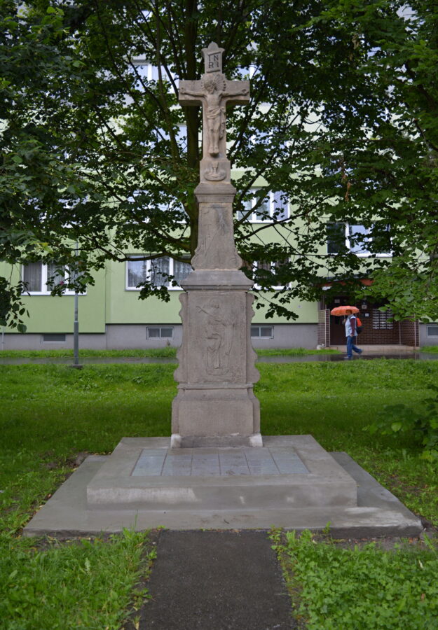 Kříž na Zimmlerově ulici byl v horším stavu. Nepůvodní je díl mezi hlavními kamennými bloky a celý vrchní díl – kříž s Ježíšem Kristem. Patrně v roce 1940 byly vytvořeny kopie původních prvků z hořického pískovce, ale jak vidíte, tento typ pískovce docela rychle zvětrává, je i měkký – ale na druhou stranu se dá dobře tvarovat.