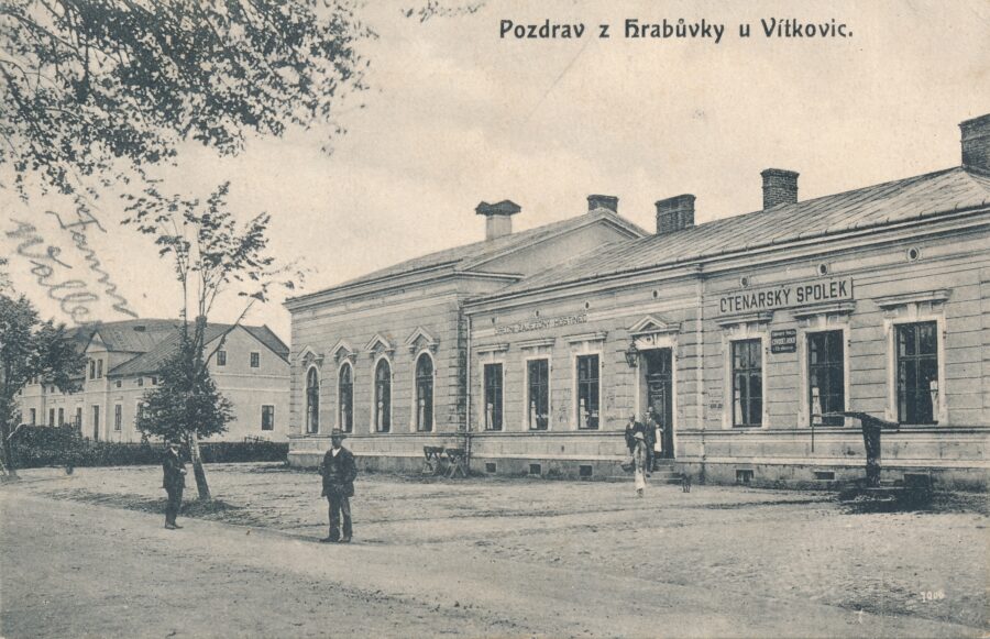 Stará Místecká silnice v Hrabůvce, vlevo budova se spolkovou místností Čtenářského spolku, počátek 20. století. Soukromá sbírka Zdeněk Wludyka.