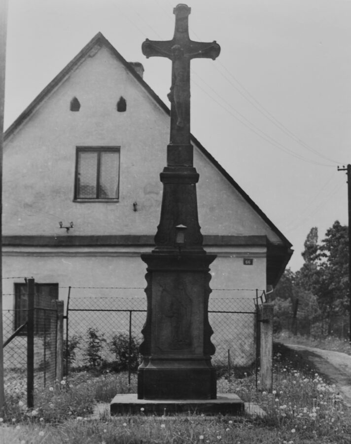 Roku 1866 byl postaven kamenný kříž na horním konci obce na náklady místního občana Josefa Tománka. Zachoval se nám dodnes. Na kříži je nápis ,,Křesťane, neopomeň pozdravit Rany PNJK. Fundator Jos. Tomanek 1866“. Je otázkou, proč nechal Tománek kříž vztyčit. V matrikách není uveden žádný záznam o tom, že by se Tománkům narodilo dítě či by jim někdo z příbuzných zemřel. Pravděpodobně tedy Tománek postavením kříže dával na odiv své společenské/ekonomické postavení či svou zbožnost. Je zajímavé, že památka byla vztyčena v době pruskorakouské války. Kříž stál na nároží zaniklých ulic Horymírovy a Horní (dnes v místech u sjezdu z Plzeňské ulice do ulice Ruské) u tehdejšího domu č. 82 (umístění kříže). V roce 1935 se však na tomto nároží začal stavět nový dům občana Drybčáka. Podle kroniky obvodu Ostrava 3 byl kříž přesunut o cca 300 m jižněji směrem k Hrabůvce na pozemek Aloise Břízy č. p. 100, č. o. 66. Podle pamětníků se však kříž stěhoval vícekrát (hovoří např. o umístění kříže na druhé straně cesty či v místě, kde se ulice Starobělská obloukem zalamuje). Archivní záznamy o případných umístěních se zatím neobjevily. Umístění památky zůstává záhadou. Při jednom ze stěhování byl kříž renovován (na snímku z roku 1935 má obnovený světlý vzhled). Dnes kříž najdeme vedle rodinného domku na ulici Starobělské 1163/61. Dívejte se však pozorně, kříž je zastrčen mezi plotem. Kříž je od 3. května 1958 veden jako kulturní památka. V současnosti (rok 2016) je památka v zchátralém stavu. Je sice kompletní, avšak jednotlivé díly jsou poškozeny exhalacemi, některá místa se počínají drolit a odpadávat.