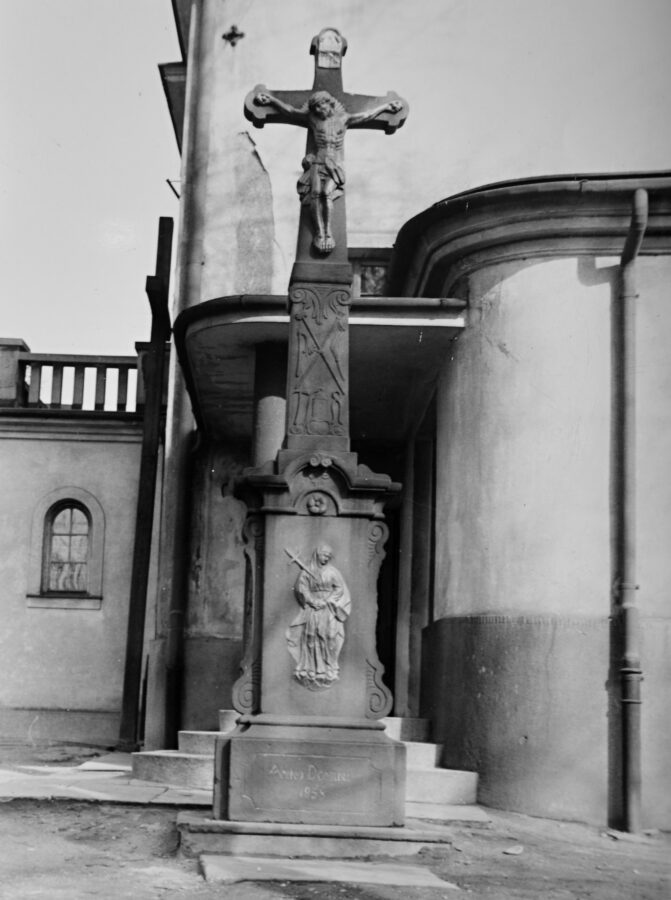 Kříž na Zimmlerově ulici byl v horším stavu. Nepůvodní je díl mezi hlavními kamennými bloky a celý vrchní díl – kříž s Ježíšem Kristem. Patrně v roce 1940 byly vytvořeny kopie původních prvků z hořického pískovce, ale jak vidíte, tento typ pískovce docela rychle zvětrává, je i měkký – ale na druhou stranu se dá dobře tvarovat.