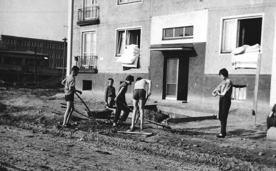 Okolo roku 1964 se začal stavět před naším domem hotelový dům. Pracovali tam mladí vojáci, pétépáci, měli volný průchod, ale nedokážu říct, kdo to přesně byl – ale normální vojáci to nebyli, měli pracovní zelené uniformy. Rodiče v práci, dvě mladé holky doma. Přišli dva, že mají žízeň, později jsem jim pouštěla muziku, sousedé měli radost (smích). Začalo se stavět sklepení, železobetonové stěny, okolo byly obrovské bahnité kaluže – a v nich tisíce žab a pulců, které jsme lovili do různých nádobek. Večer byly koncerty žab, při nichž se nedalo ani usnout. No a nakonec vyrostl hotelový dům Vítek. Byl to typizovaný panelák bez balkónů. Současně se stavěly školy a školka na Klegově ulici. Tehdy byly školky velmi zaplněné.